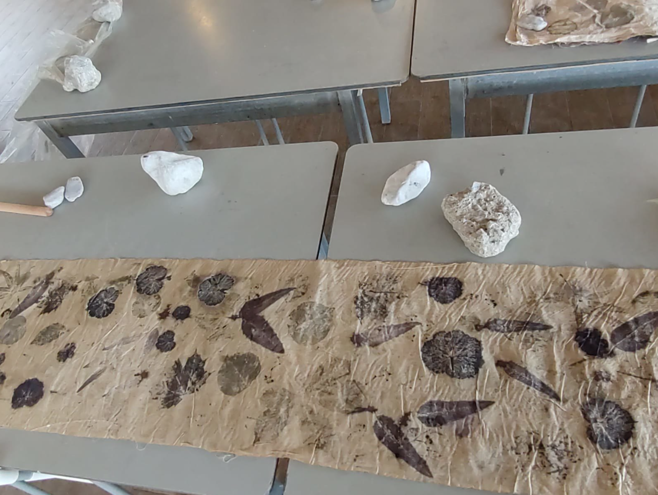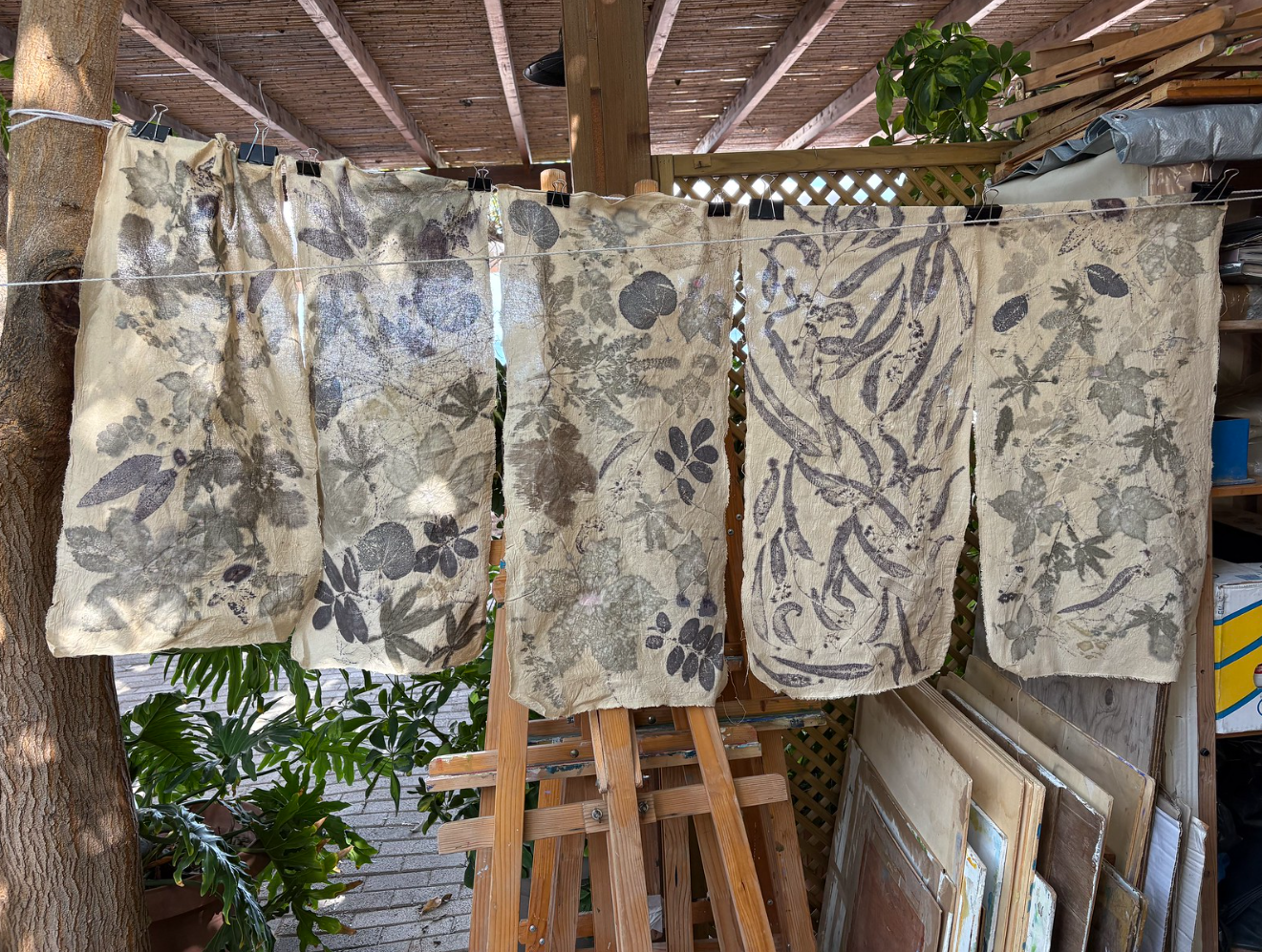 Na afloop heb je verschillende mooi ge-ecoprinte katoenen stoffen (kaasdoek en ongebleekte katoen) en twee werkstukken van zijde (waaronder een zijden sjaal (45×180) plus de ecoprints op papier, die vaak niet misstaan in een mooi kader.