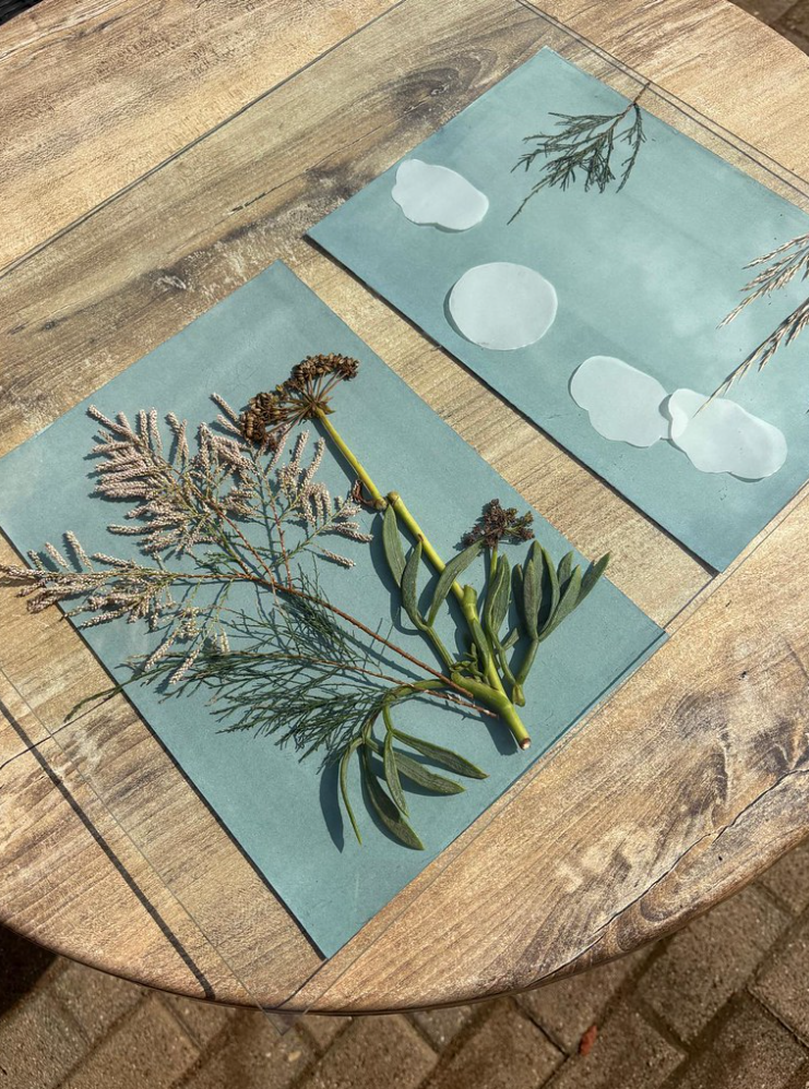 Door een voorwerp op lichtgevoelig papier of stof te leggen kan je d.m.v. van zonlicht een afdruk maken. Afhankelijk van de kracht van de zon, de plek waar je bent op welk tijdstip, ontstaat al in een paar minuten het beeld. Alles wat afgedekt was tijdens de belichting wordt wit, de rest blauw.